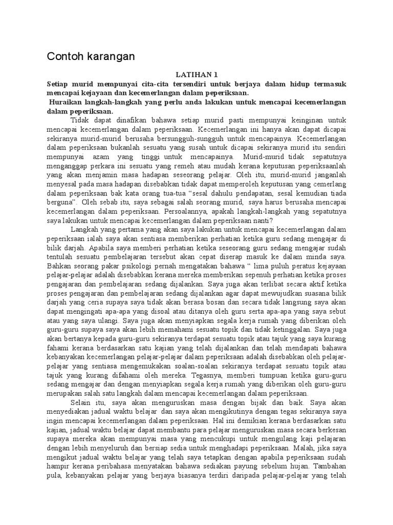 Aktiviti tersebut boleh dijalankan di kampung-kampung dan juga di kawasan perumahan. Bukan latih tubi senaman tetapi latih tubi soalan-soalan peperiksaan yang terdahulu soalan percubaan semua negeri dan soalan-soalan yang menjadi ramalan pakar pengubal soalan. Contoh Karangan SPM Setiap murid mempunyai cita-cita tersendiri untuk berjaya dalam hidup termasuk mencapai kejayaan dan kecemerlangan dalam peperiksaan.